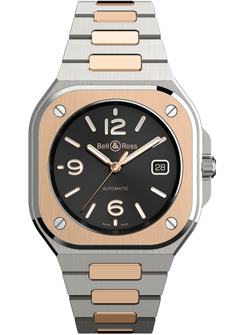 這一腕錶是第二款新加入BR05都市系列,外型醒目又經典,它可以帶你跳進80年代的雙色設計。經過緞面處理及打磨的精綱與18K玫瑰金組合在一起, 當專業物料遇上貴重物質,強壯與細緻融合起來。黑色太陽紋令玫瑰金鑲貼的數字﹑時標﹑時及分針完美地對照出來。為了達最佳易讀性,它們都充滿Super-LumiNova®夜光材料。這款雙色物料的時計搭載BR-CAL.321機械機芯,配備360°釕塗層陀,及帶防眩目塗層的藍寶石水晶玻璃表背鏡面。藍寶石水晶玻璃底蓋透露這枚機芯的跳動。