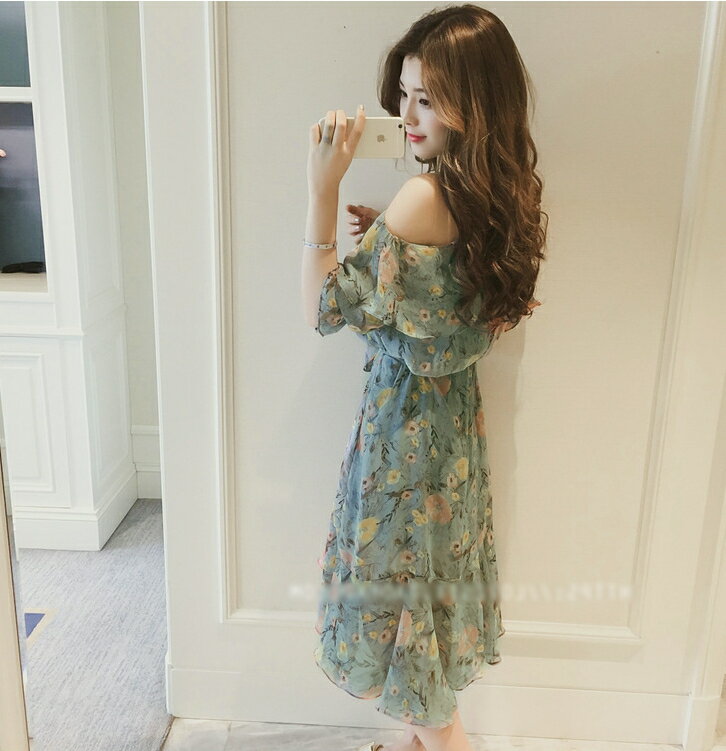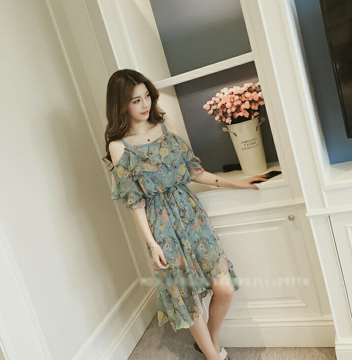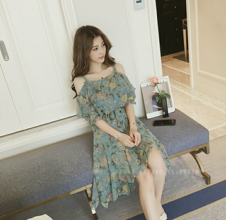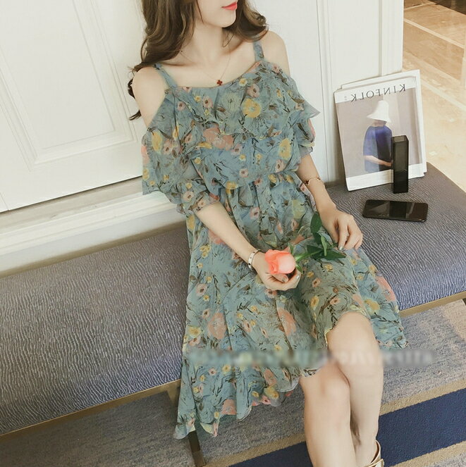 甜釀春色.碎花一字領露肩吊帶前短後長洋裝 商品尺寸 : S/M/L/XL/2XL 附綁帶